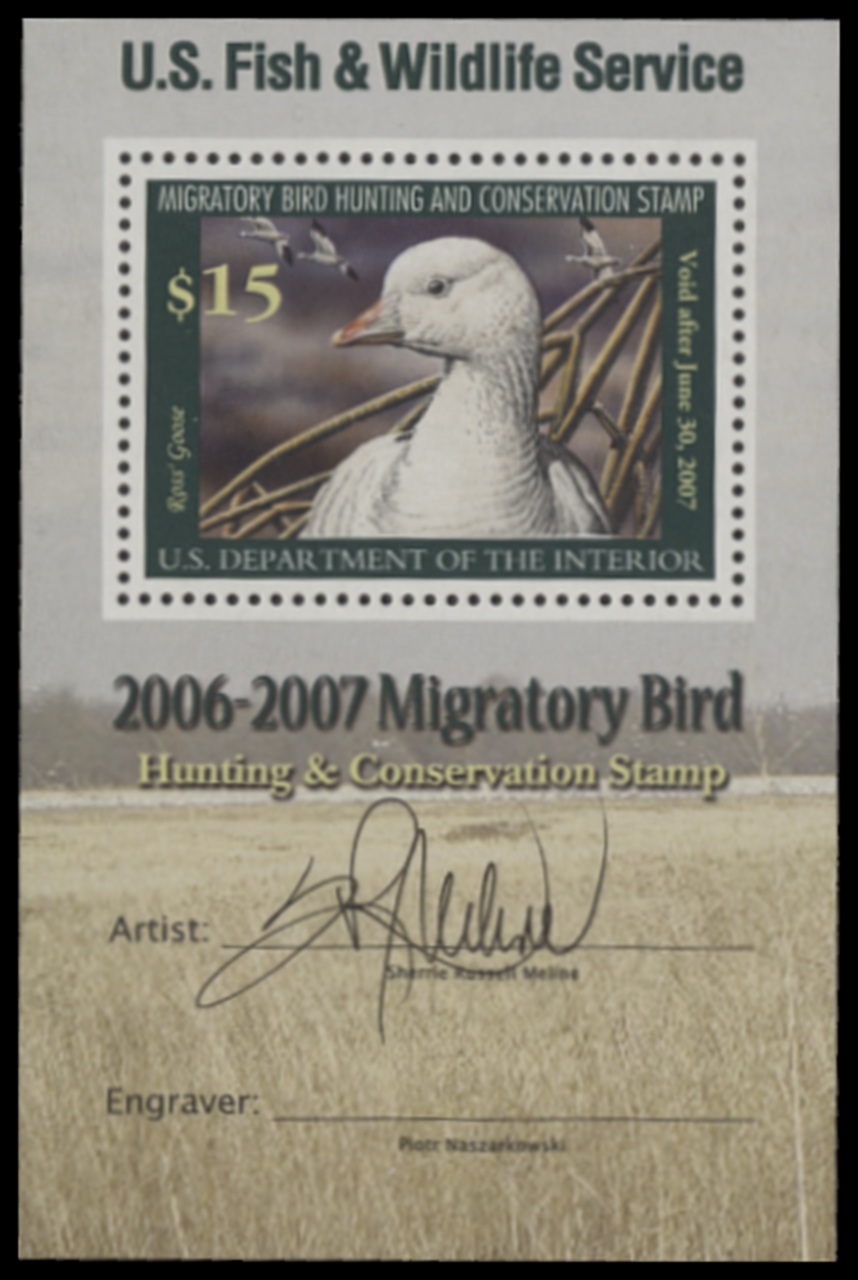 RW73B 2006 Federal Duck Stamp. Mint Never Hinged. Fine - Very Fine. Ross' Goose by Sherrie Russell Meline.