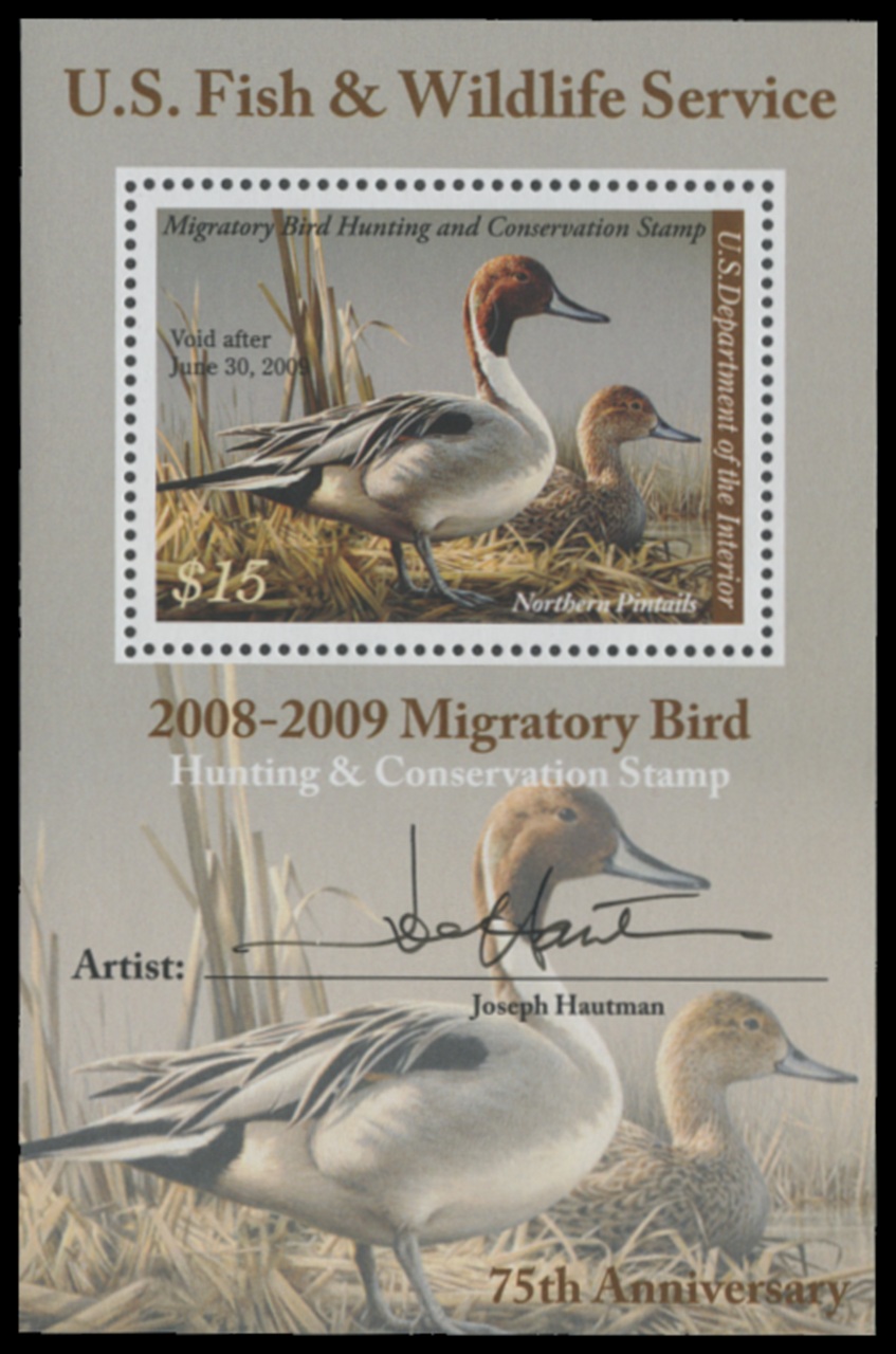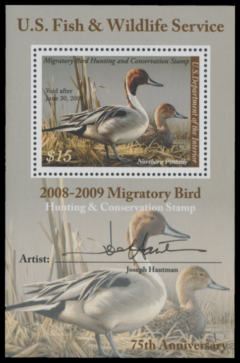 RW75B 2008 Federal Duck Stamp. Mint Never Hinged. Fine - Very Fine. Northern Pintails by Joe Hautman.