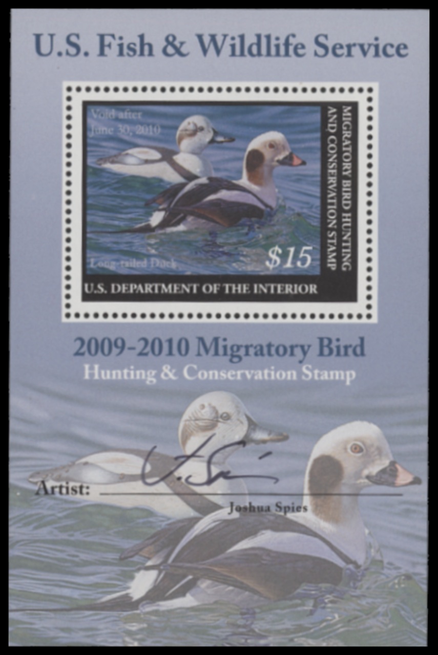 RW76B 2009 Federal Duck Stamp. Mint Never Hinged. Fine - Very Fine. Long-tailed Ducks by Joshua Spies.
