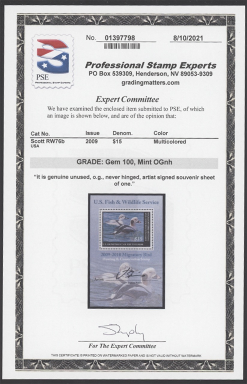 RW76B 2009 Federal Duck Stamp Souvenir Sheet. Mint Never Hinged, Artist Signed. Graded GEM 100 with PSE Cert. Long-tailed Ducks by Joshua Spies.
