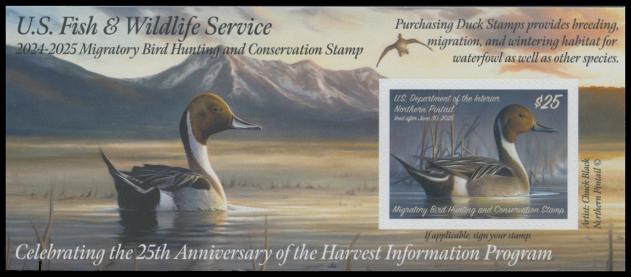 RW91A 2024 Federal Duck Stamp. Mint Never Hinged. Fine - Very Fine. Northern Pintail by Chuck Black.